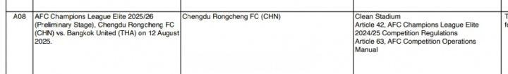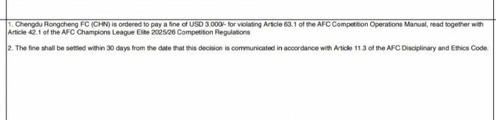 亚足联纪律委员会对成都蓉城处以罚款3000美元的罚款。原因为在今年亚冠精英联赛附加赛的比赛中未能按时清空体育场的商业标识。根据亚冠精英联赛规程和亚足联赛事操作手册规定,承办赛区必须在赛前2天将体育场范围内未经亚足联授权的商业标识进行清理、移除、遮挡,以确保亚足联及其赛事赞助商的商业权利,如未能在规定时间内交付清理后的体育场,则会被亚足联实施罚款处罚。